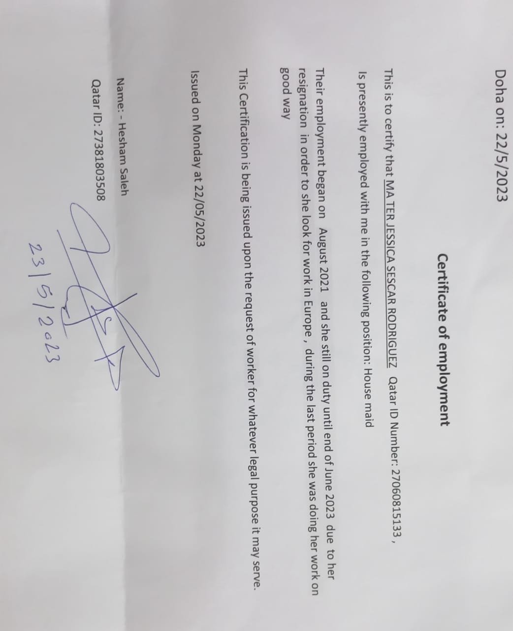 | Last Employer Name | Hesham Saleh/Qatar |