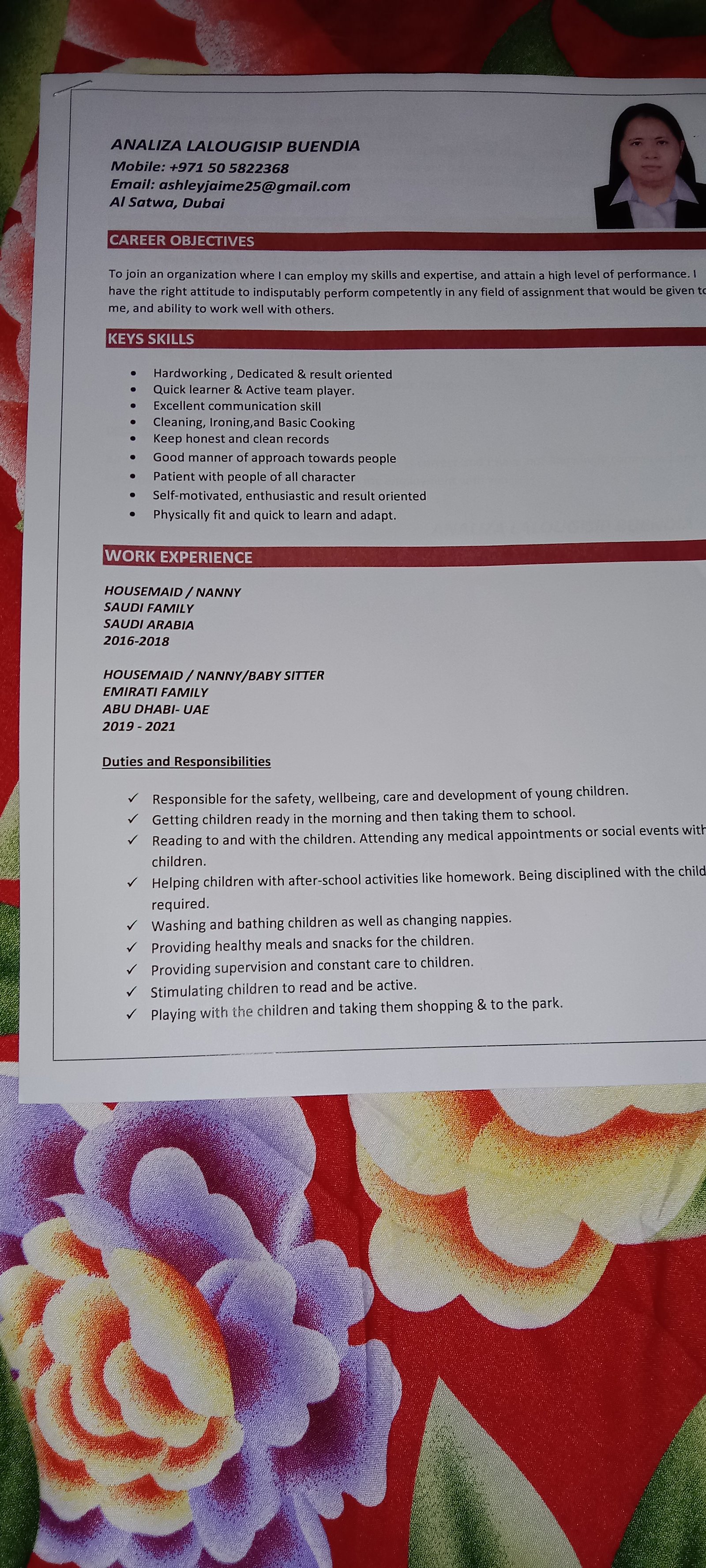 Hi,you can call me Ana,I'm looking for a new job,I have 2yrs.experience in Saudi in local family with 4 members in the family,I'm all around housemaid/nanny,I'll do cooking,cleaning,washing,ironing..Year 2016-2018..From 2019-2021 im working in Abu Dhabi UAE in Emarati family 3members in the family the baby is 8months old,I'm a full time housemaid together taking care and 8months old baby.2021-2022 I'm working in German-Italian couple with 2dogs,I'll do cleaning,washing,ironing,and helping in the kitchen when my madam wants to cook,I'll walk the 2dogs every morning and evening.Sad to say they move to Thailand so they canceled my visa after 1year.I have an recommendation letter from them,and if you want reference from them I'm willing to give there number.Thank you so much!